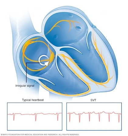 Supraventricular tachycardia, or SVT, is a condition in which the heart suddenly beats much faster than usual because of improper